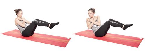 起始位置:与仰卧起坐一样,在开始时,你躺在垫子上的背部长度,你的腿弯曲,你的脚设置。然而,手臂没有戴在耳朵上,而是越过胸部。
