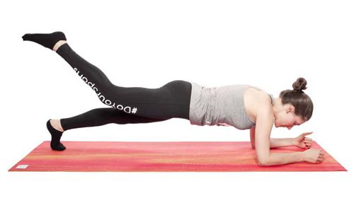 铺板:现在你通过拉紧腹部和背部肌肉来抬起你的膝盖,直到你的身体形成一条直线。你的身体只有前臂和脚趾接触地面。你的目光指向垫子的前面。