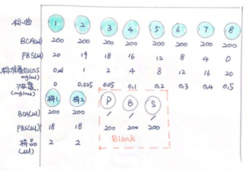样品+2μl的原因:因为做标曲时PBS+标准蛋白一共加了20μl,样品应该也+20μl。But!!!提蛋白不易,谁舍得加20μl用来测浓度,所以,我们加2μl样品+18μlPBS,相当于稀释十倍。也就是说,测出的浓度最后要×10才是实际浓度。