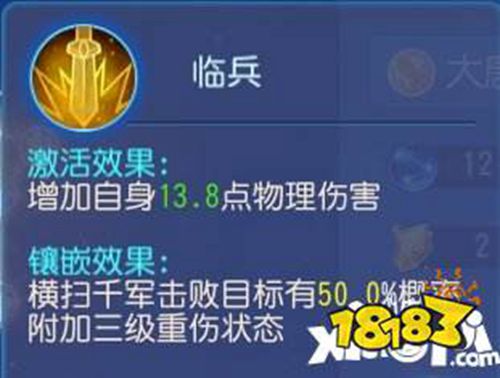 临兵:增加物伤,横扫击败附加重伤。重伤在战斗中是很强大的debuff,后面会有分析。四扫是很容易击杀单位的,这个镶嵌使得横扫兼具了单刀和弱点的功能性。