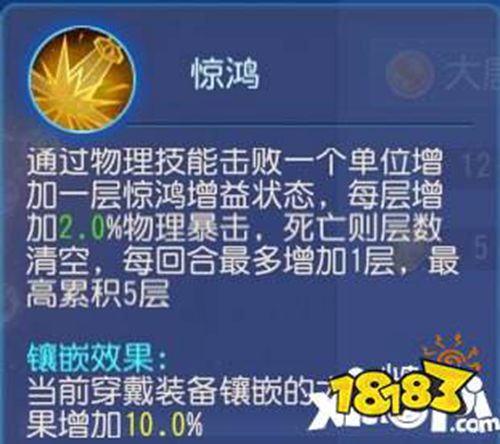 惊鸿:大唐的另一个buff,击杀单位加一层暴击,还能加强太阳石效果,增加面板伤害。暴击率是我很推荐的一个属性,杀气诀的溅射伤害为本次出手造成伤害的三分之一。暴击不仅增加点杀成功率,还能使溅射伤害更高。