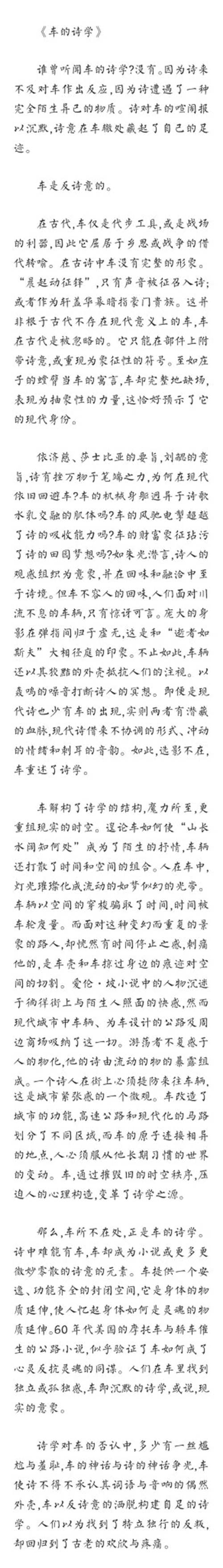 而且这篇《车的诗学》不是套路文(不是事先准备好的),车的意象在这篇文章中无法替换,一旦替换成其他的意象,整篇文章也就崩塌了。