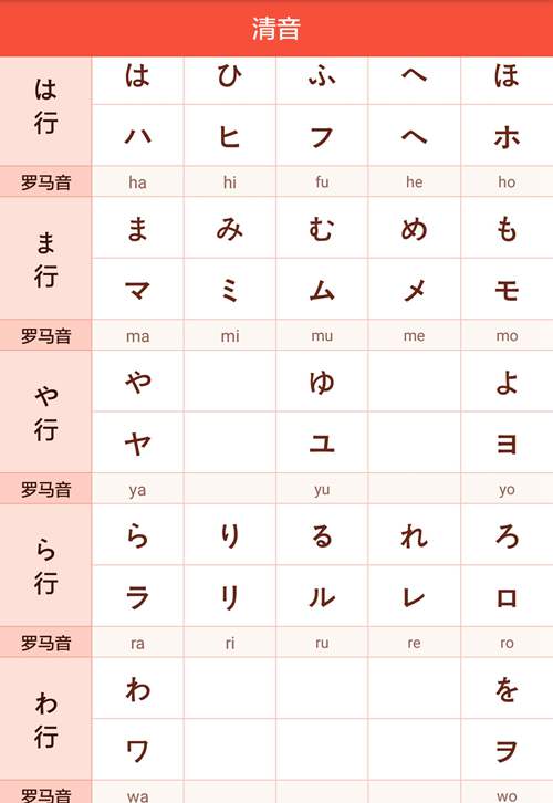 这里需要注意的是ふ(fu)的罗马音形式与同行的不同,且不能读作汉语中“夫”的音,而是介于“扑”和“夫”之间,上牙抵住下唇轻轻的将气流呼出。日语中的“r”类似于汉语中的“l”,所以ら(ra)行是读作:“啦 哩 噜 嘞 咯”,绝不能把り(ri)读成汉语中的“日”的读音,而是“哩”浊音