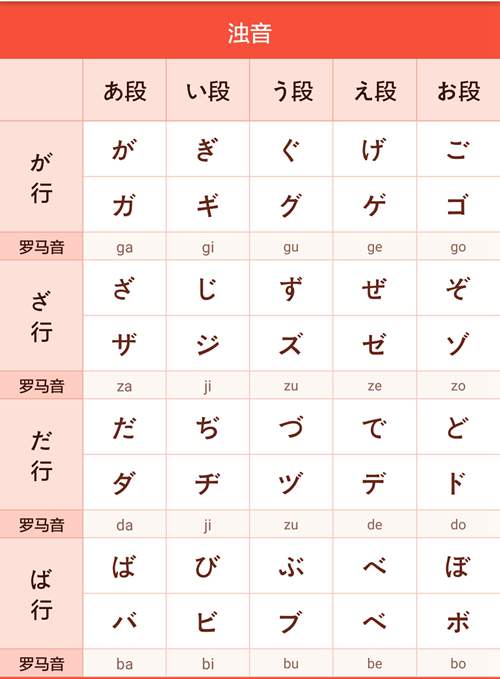 其实不难看出,浊音就是在清音中的かさたは行的假名的右上角多加两笔而已,需要注意的是じ和ぢ (ji), ず和づ(zu),罗马音形式较为特别,且两个的读音是相同的,要区别好半浊音