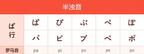 半浊音只有一行,书写上只是在は行的假名的右上角加个“°”拗音
