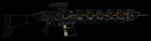 如果有熟悉“62号计划”的人能够亲眼见到这种武器的话,他们一定会惊讶地发现自己长久以来追求的目标已经在黑石组织的手中得到了实现。比起仍然只能算是半成品的EM1电磁脉冲步枪来,黑石组织制造的高斯步枪发射的是实实在在的2.54毫米弹丸,光看口径似乎毫不起眼,但在极高的初速下,任何低估它破坏力的想法都是极为愚蠢的**。这种高斯步枪将弹丸和神器碎片整合在弹匣之中,这样就保证了它的使用者可以依照传统的枪械操作习惯来摆弄这种武器。**即使有着神器的碎片作为能源,一个弹匣也只能支持十次射击,可见其能耗之大以及威力之强
