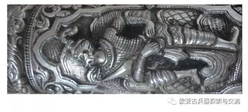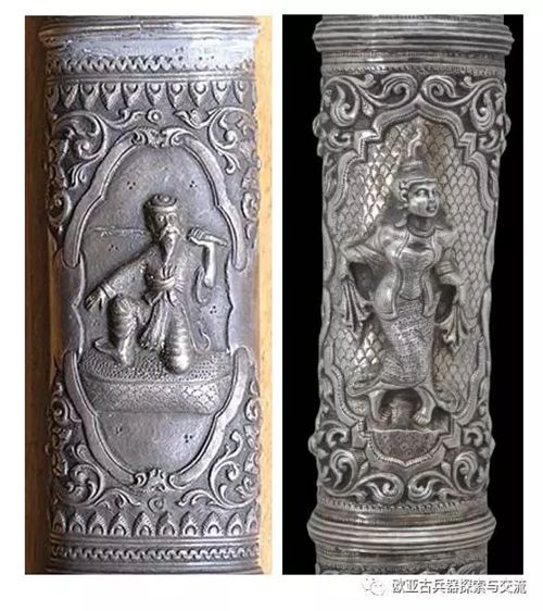 此期缅刀中的精品,通常刀身都有鋄银,所选择题材比较多的是佛教《本生经》的故事、印度神话,描述佛陀前世在菩萨时候的故事;也有以缅甸传统神话传说为题材;还有出现自然崇拜,如虎、鹿等动物形象的题材,或者是植物类的卷草花纹路。
