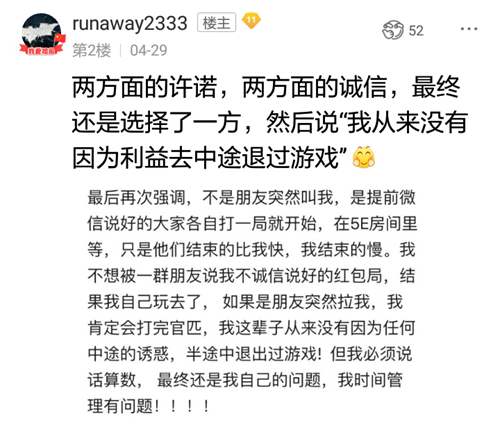 两场比赛,一面是4个不熟悉的人,一面是约好的朋友和数十万等待的观众,更应该选择对谁负责?孰轻孰重一目了然,舍小取大,理所当然。QUQU的做法宜公宜私,是无奈之时的明智之举,相同的情形,在生活工作中,诚信的贴吧网友遇到时,他们会怎样选呢?诚信是相对的,QUQU的做法实现了对大多数人的诚信。