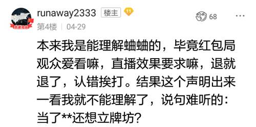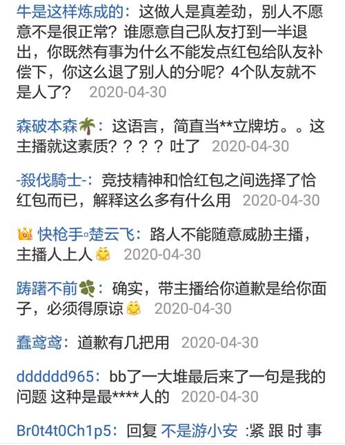该帖的内容同该玩家在游戏里说话的语气般充满怨恨,而许多网友也纷纷发贴添油加醋,笔者悲哀地看完了大部分,把他们的指责归位这三类:一是游戏中放弃给新人玩家造成了不良影响,破坏了游戏环境;二是财迷心窍,背信弃义,德不配位;三是QUQU与他的粉丝素质低下,同流合污,狼狈为奸。帖子的作者几乎一股脑将所有游戏主播能犯的毛病都定在了QUQU的头上,不仅如此还与网友在评论区一起谩骂、侮辱所有存在异议的人,不断地恶语伤人、推波助澜。甚至有人觉得这还不解气,又发布了题为“像QUQU这样的无良主播应该被封杀”的帖子,又引来了争议。