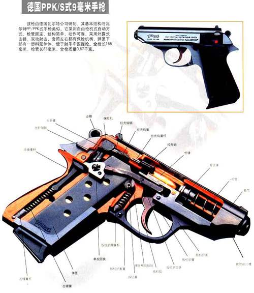 1931年,卡尔·瓦尔特兵工厂为满足高级官员和秘密特工以及刑事侦探人员的需求,又推出了PP手枪的变型枪,这就是同样著名的PPK(Polizei Pistole Kriminal)手枪。与它的“兄长”相比,PPK战技性能不减,“体形”却更轻便小巧,隐蔽携带更为方便,同时,在使用安全性上的考虑也更为周到,如在握把底面后端增加了背带环等。因此,PPK手枪似乎更为受人宠爱。PPK手枪的问世,事实上与PP手枪构成了一个适合于特殊工作需要的自卫手枪族。PP/PPK 手枪的结构极为简单,两枪的零件总数分别是42件和39件,而其中可以通用的零件为29件。时至今日,PP/PPK手枪仍在欧美乃至世界各地广泛使用。