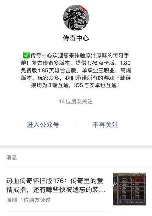 下载关注微信公众号【传奇中心】本期推荐复古传奇180版本!传奇中心专注于挖掘各种稀奇好玩的三端互通传奇手游,如复古传奇1.80经典版、1.76点卡版、1.85英雄版;复古微变版;三合一单职业版本;传奇世界复古,每个玩家都能在这里找到自己喜欢的传奇版本,百分百还原当年传奇,原汁原味,绝对经典!