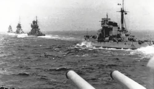 该照片由巡洋舰“加里波第”号船员拍摄,是马塔潘角海战为数不多的照片之一。从左到右分别为“扎拉”号,“波拉”号,“阜姆”号以及“阿布鲁齐公爵”号,其中“阜姆”号被喷上了涂装,所以看起来暗一些。