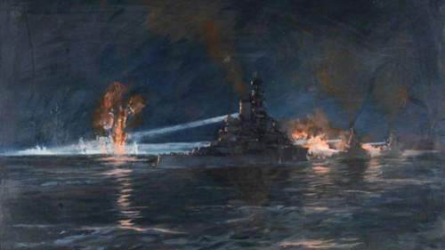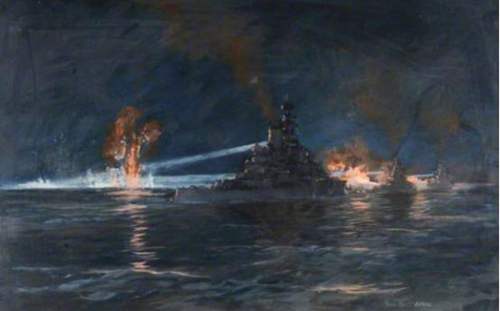 23时30分许,英军驱逐舰突然打开探照灯,横扫眼前的目标海域,“阜姆”号行踪暴露无遗,“厌战”号与“勇士”号即刻开火,“阜姆”号的前后炮塔被命中后全舰起火,船体逐渐瓦解,随后沉入大海。卡塔内奥在震惊之余束手无策,没有雷达也没经过夜战训练的意大利海军只能坐以待毙,直到英军的战列舰将主炮瞄准至他所在的“扎拉”号。