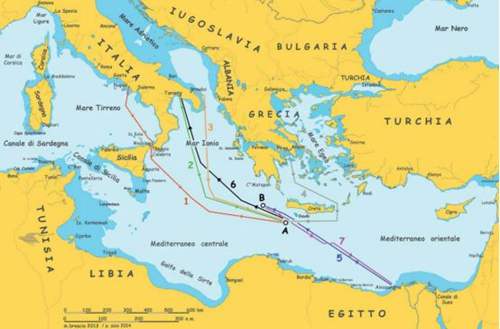 马塔潘角海战两军舰队航路示意图。其中1/2/3号线为意军舰队,4/5号线为英军舰队,6号线为意军舰队撤离航路,7号线为英军返回亚历山大港的航路。