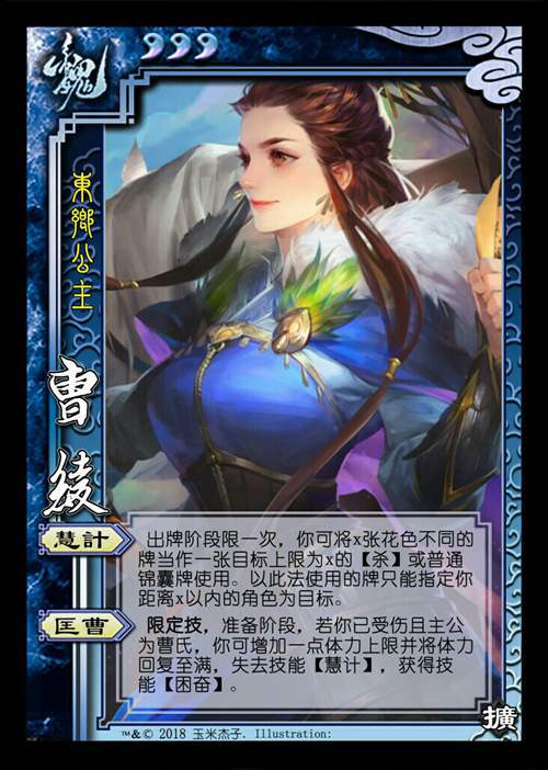※【匡曹】是限定技!限定技!限定技!!重要的事情说三遍,不是觉醒技,不是锁定发动的。这给了曹绫在大残即将当场去世时一个重生的机会,重生后技能显得没有以前那么抢劲毕竟多了血多了体力上限也出于平衡考虑,困奋多摸牌其实发挥也没有想象中那么差。同时也契合了(游戏中的)历史。毕竟曹绫经过重重努力砥砺奋进都做过不少牺牲嘛,而且不断失去体力的她还是没能挽救曹家。