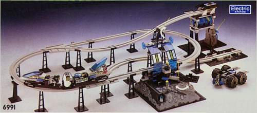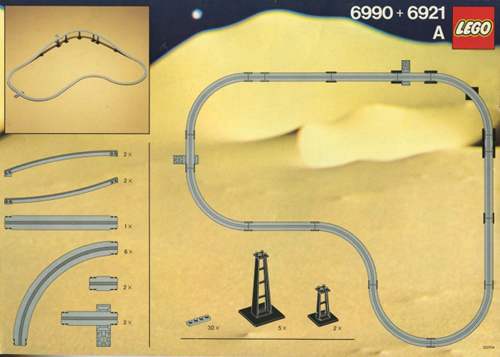 首先先来介绍一下单轨系统,单轨(Monorail)系统指的是以灰色的特殊轨道为基础,能够克服普通轨道所难以实现的上下斜坡功能的一套单独的轨道系统,轨道本身不带电,通过单轨列车的马达进行驱动,发行时间从1987年到1994年,包括了6990、6399、6991三套单轨大套装及6921、6347两套单轨补充包,涵盖了太空和城市两个系列,而其中玩家最喜欢的单轨set就是6399!