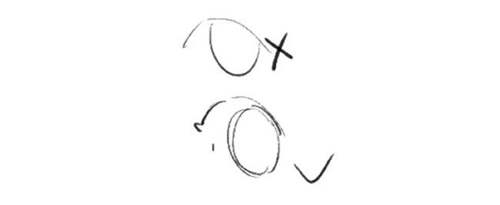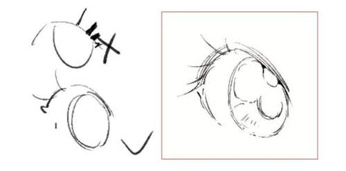 如果要显得角色可爱,把外瞳孔画得圆一些。画成半圆,就会像死鱼眼。