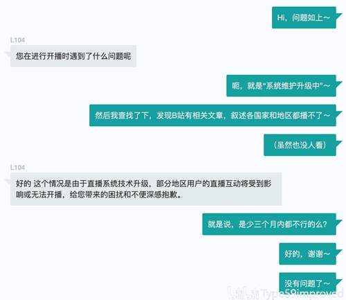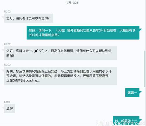 在此之后,我又向人工客服咨询此事。这一次,我尝试了用硬气直接一点的口吻询问(我在交际中真的硬气不起来,无论是现实还是网上),如图-02和03。在图-03里,我们可以看到客服并没有否定这一点(我说完没有问题后,客服回了一句“嗯嗯不客气”而非肯定或否定我的猜想,因为就一句话所以没截图)。也就是说,在国外的同志们可以死心至少三个月了。况且,在檄文的评论区里,我还看到了这样的内容:“海外主播在站内本来就是少数,而且大主播都会给门路,所以站内可能为了省点麻烦事,根本不介意一刀砍,因为砍不死几个人,不影响收入。说不定哪天因为过激内容就偷偷ban掉海外专栏,海外上传视频,海外用户站号。”