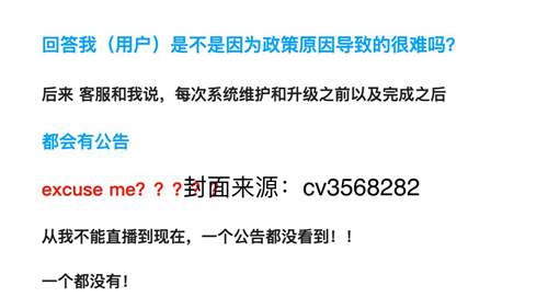 我自认为还算是有礼貌的,希望我不会因为24小时内的任何和谐而成为“网暴人士”。同时,套用檄文评论区的几段话:“同样的我们能开播就是给了身份证信息实名验证,为何还需要被去指责和封锁。很多时候直播根本不是为了赚钱和博流量。我们只想从官方的公告里看“xx原因”、“预计在xxx时候恢复部分地区直播系统”。当然,可以明日复明日,一直不恢复,但是至少一则公告表明了官方在意用户群体,同时也是一种态度。”