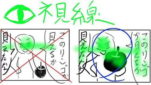 (1)现在有一部漫画分镜,需要主角要强调手中的苹果。绿色就是读者阅读台词与观察人物脸部的视线路径——