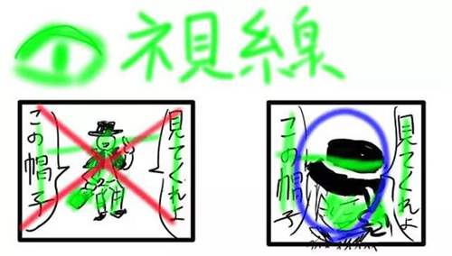 和刚才苹果的例子是一个道理,通过描绘出读者的阅读路径,可以得出:如果剧中人物想要强调头上的帽子的话,是完全没有必要在本来就不大的空间里画出整个人物,反而会和帽子抢镜头,只要画出头部就足够了