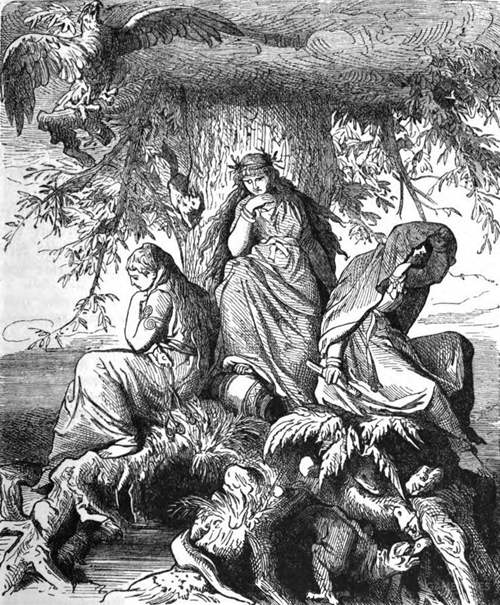 此外,在大树的三条树根处还有些毒蛇猛兽,神头鬼脸儿的不请自来。大树的第一条根伸入乌尔德之井(Well of urd),命运三女神就住在井旁,大姐乌尔德(Urd)掌管过去,总是满面愁容,老二薇尔丹蒂(Verdandi)司掌现在,目光沉稳而坚毅,老三斯蔻德(Skuld)手里拿着命运卷轴能预知未来,却总是黑纱蒙面不以真面目示人。