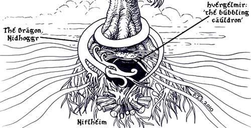 还有一条树根则伸向沸腾之泉-赫瓦格密尔(Hvergelmir),有一条名叫尼德霍格(Nidhogg)的毒龙带着自己一帮小弟盘踞在这里,孜孜不倦地啃噬大树的根,预言中,毒龙啃断树根的那一天就是诸神黄昏的降临之时。