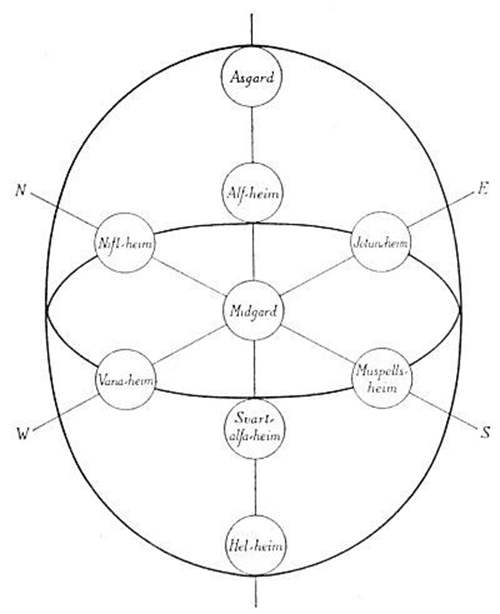 天地九界,除了前面已经提到的金伦加鸿沟北侧的冰之国(Niflheim)、南侧的火之国(Muspelheim)以及东方的霜巨人之国(Jötunheim)外还有六个,我们这里就来盘点一下。