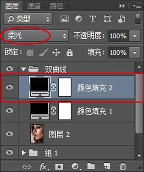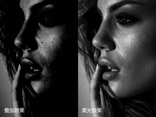 第2步,再新建一个黑色填充图层,设置图层的混合模式为柔光,如图所示,使灰度图像变暗,反应出人物皮肤的细节。