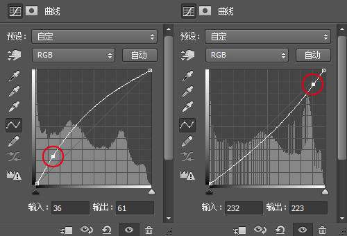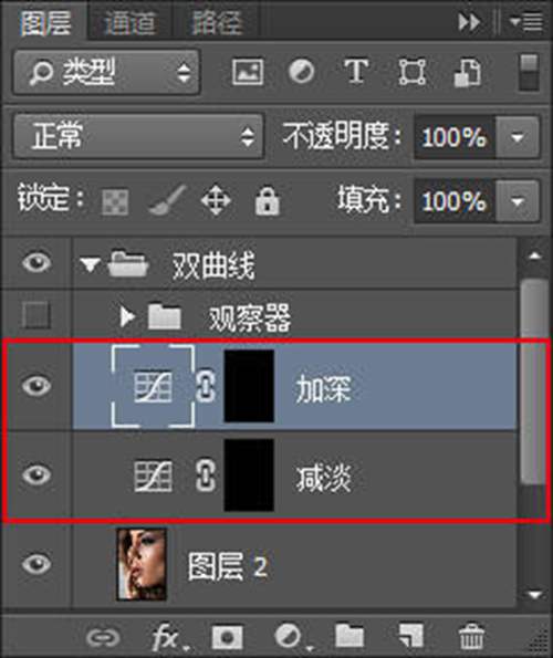 第4步,在观察器之下,图像之上分别建立两个曲线调整图层,一个是在暗部提亮,另一个是在亮部压暗。