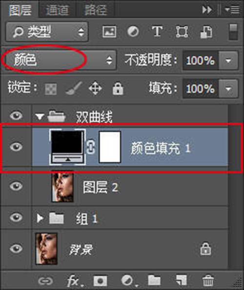 首先,我们先把双曲线修图的方法搞搞清楚,第1步,新建黑色填充图层,设置图层的混合模式为颜色,如下图所示,使彩色图像转变为灰度图像。