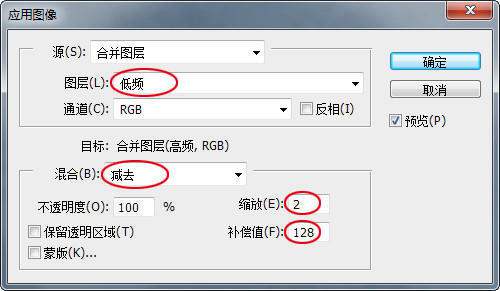 第6步,选取命名为高频的图层,执行应用图像命令设置如前,然后执行高斯模糊,确定后反相,删除低频层,并在高频层上建立蒙版并填充黑色,用100%的白色画笔擦出五官,不影响明暗交界,确保必要的清晰度,完成高低频磨皮,如图所示。