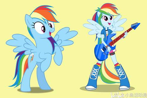 《小马宝莉》是一部美国动画片,讲述了关于一堆小马的故事,云宝黛西就是其中的小马之一。她是一只会飞的天马,拥有蓝色的皮肤和彩虹色的鬃毛,虽然是女孩子但平时的行为看起来更像是个假小子!当云宝黛西拟人化之后,俨然成了喜欢音乐的小青年,弹着电子吉他,彩虹长发都飘到地上了,是不是漂亮了许多呢?