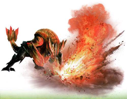 而当猎人攻击其身上的部位时,这些黏菌会直接在它的身上引爆,单单是这种受到冲击自发性的爆炸所产生威力就能达到【大桶爆弹】的能量。而当这些黏菌进入到一种临界点的时候,它的身上就会变为橙红色,这种状态下则更加危险。先不说攻击它所产生的反应,在橙红色状态下,其攻击都会附带上威力巨大的爆炸,据说能够将任何东西一击直接击灭