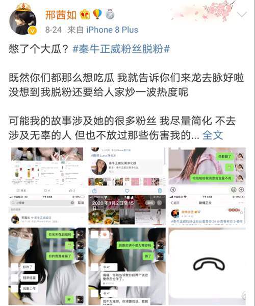 最近一位名为“邢茜如”的秦牛正威老粉大型脱粉现场,连发数条动态宣布不再喜欢秦牛正威,表示自己多年来一直为秦牛正威付出,从她还是小网红时就粉上了她,每次微商带货都是第一时间购买,被黑时自己顶着谩骂澄清,参加《青你2》时,用了自己所有的时间为她剪视频,为她反黑。