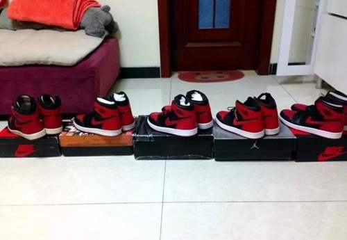 Air Jordan 1 黑红配色,没记错的话一共发售过这7次:元年真正og款,1994年第一次复刻,2001年复刻,2009年以DMP套装形式复刻,2011年的“禁穿”配色,2013年复刻,还有2016年复刻。