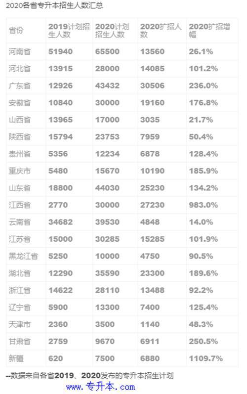 从表格中可以看出,各省市都扩大了今年专升本的招生名额。