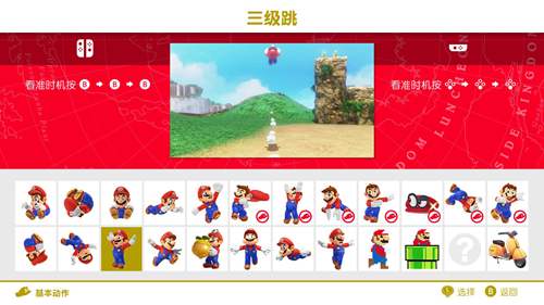 所以我建议,如果你是第一次游玩这样的3D马里奥,一定要认真研习动作指南,并且确保游戏教给你的每个动作都能熟练运用出来。不需要刻意去做练习,只需要在兜兜转转找月亮的时候,顺手试着用用就行了。但是一定要有主动练习的意识,直到能给结合具体情况灵活运用。比如游戏中最简单的扔帽操作,如果你只是拿它打怪,附身,那就太浪费了,它还具有增加滞空时间的作用。马里奥跳到最高点后,扔出帽子,可以让马里奥跳的更远一些,还可以借此修正跳跃(比如跳过界了丢一下帽子,增加拉回平台的几率),大幅增加容错率。前扑攻击也有学问,它可以让你额外拥有一小段位移,这一小段位移多次救了我的命;从很高的地方跳下的时候,也可以在快落地的时候使用一次前扑,这样落地的马里奥不会出现“脚麻”硬直(都市国的福音)。我最后尤其要向各位安利的,就是神奇的“三段跳”,这个动作在蘑菇王国的某个关卡会有教学。其原理是,马里奥跳起,按Y丢出帽子,马上按一下ZL,接上Y前扑,后一次Y按下后不要马上松开。这时帽子由于长按Y不会返回,马里奥会刚好扑到帽子上,然后做出一次踩帽跳,这样你就在普通跳跃之外一次性拥有了额外的三段位移(事实上如果跳向较低的地方,三段跳之后还能再用一次前扑,还能再多一段位移)。本技能极为逆天,自从掌握它之后,我马里奥的机动性大幅提升,很多以前不敢过或者是要等平台的地方都可以强行越过去,感觉自己成了偷鸡之王,畅爽无比……强烈建议还没掌握此技能的务必尝试一下。(不过既然游戏都亲自教学了这个操作,很多三段跳能过的地方可能本身就是故意设计的,我们只看到了第一层:D)
