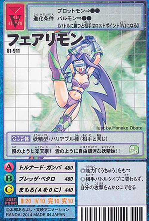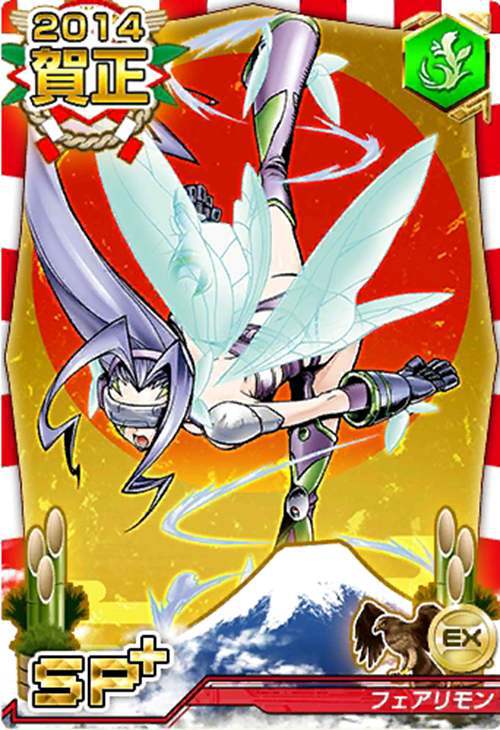 进化自:Any Adult or Any Armor Digimon (with the Human Spirit of Wind)、Hawkmon、Izumi Orimoto (with the Human Spirit of Wind)、Palmon、Piyomon、Plotmon(with or without the Human Spirit of Wind)、Tailmon (with the Human Spirit of Wind)、Tinkermon