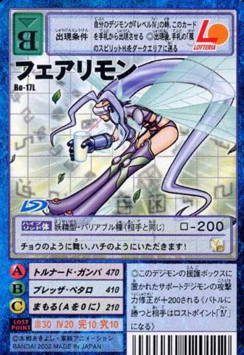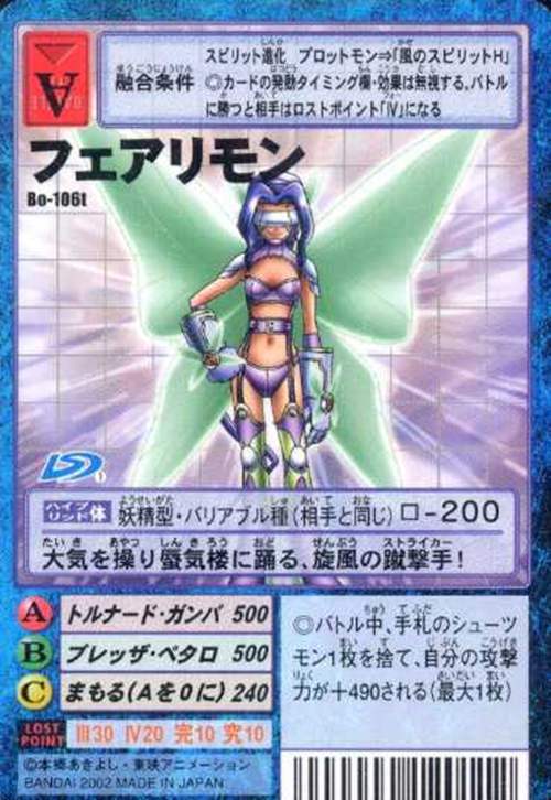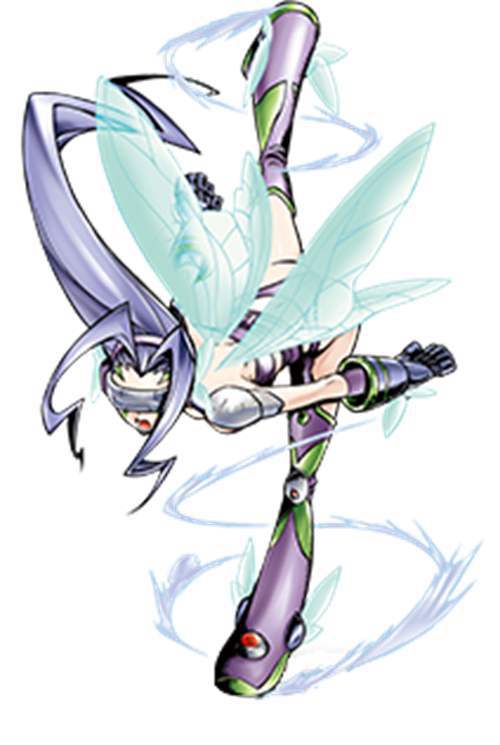 设定资料(中文):寄宿了传说中十斗士的力量,拥有风之能力的数码兽。擅长自由操纵大气让敌人看到海市蜃楼,制造真空状态发生「镰鼬」现象的攻击。比起实际战斗能力更擅长情报战。天真无邪且好奇心旺盛的性格,虽然是个说话轻佻的麻烦制造者,不过因为本人完全没有恶意,所以不怎么会惹人讨厌。彻底贯彻天真主义,遇到一点点困难也会笑着摆脱过去,拥有坚强的精神。必杀技是倒立着施展旋风脚「旋风腿」,以及向敌人猛冲过去,连着踢完过后使出转身踢的「蔷薇暴风」。
