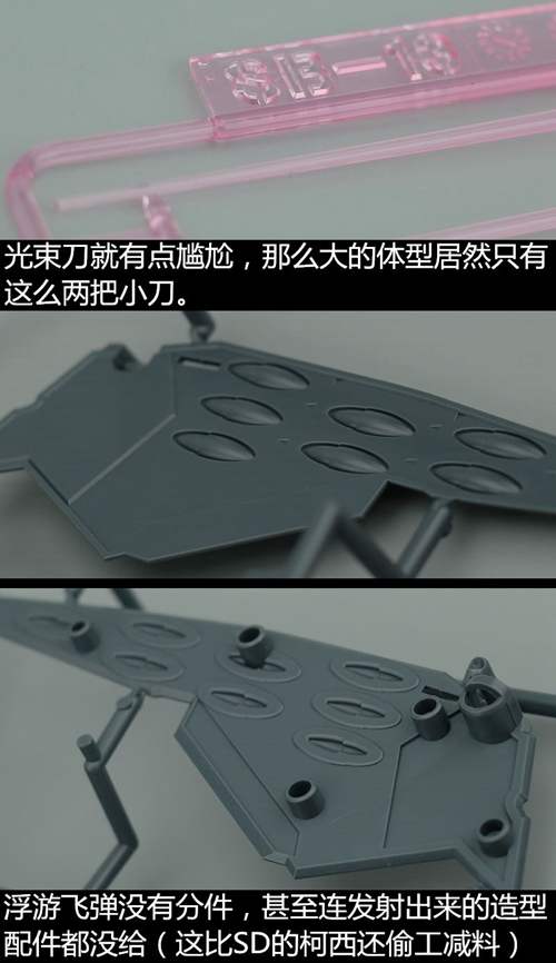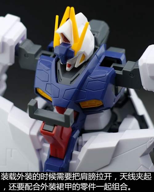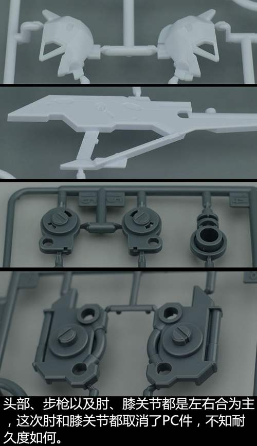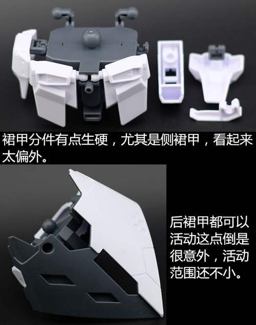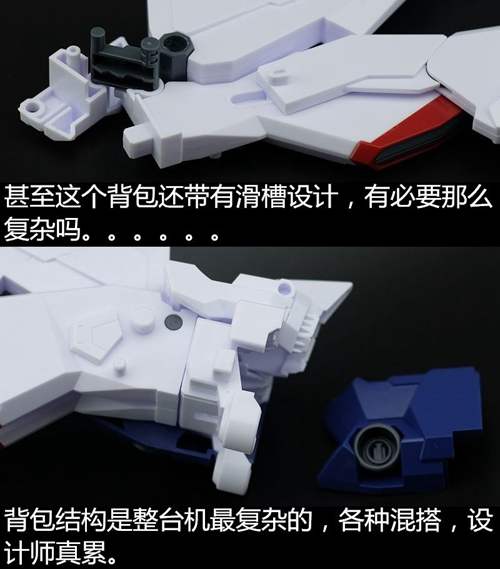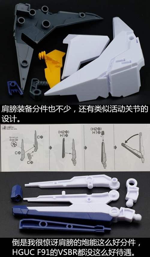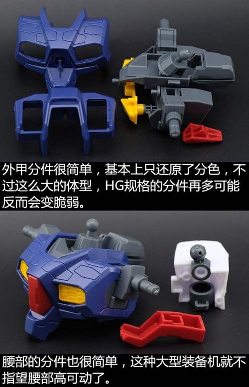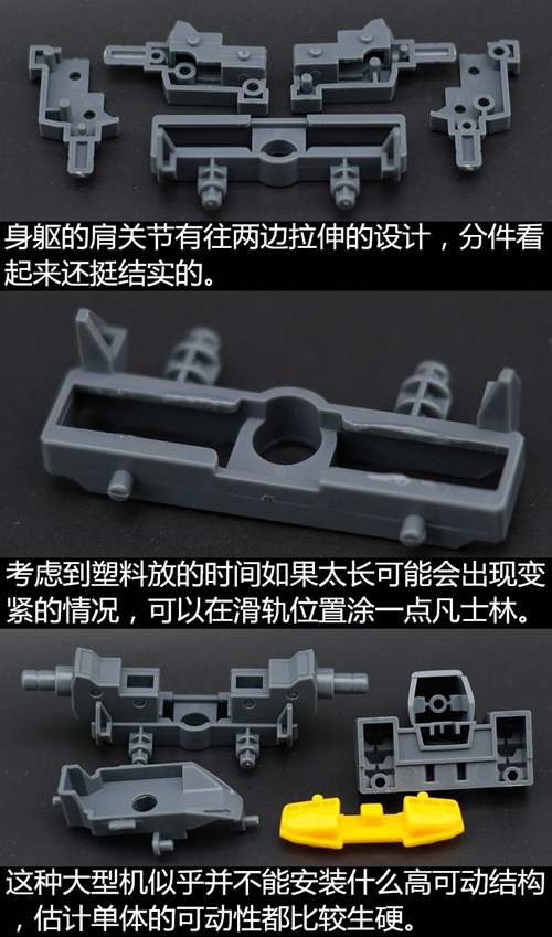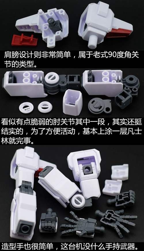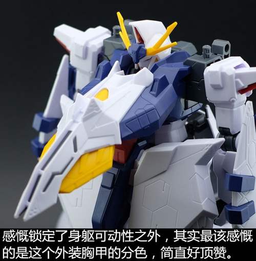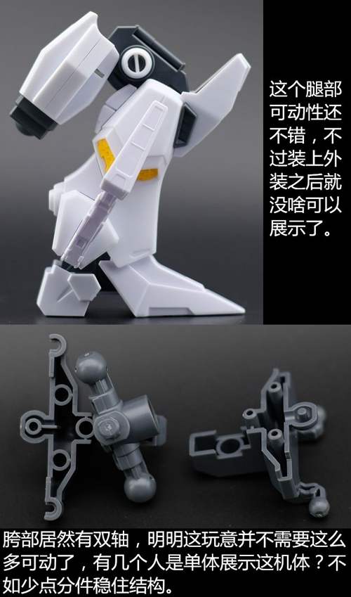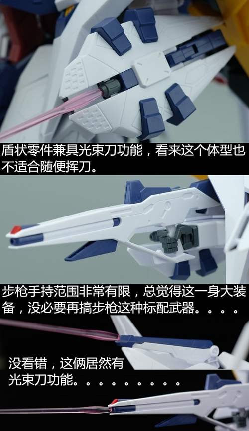 说一下整体设计:这个套件单体状态可动性还可以,但是手臂肘关节会显得比较生硬,好像为了提高可动性硬生生加了一个不受力的小关节一样,后面看上去很温和,不过把玩起来倒是没啥,如果不打算拆外装的话这个肘的小关节上胶水粘死更好。可动性什么的,套上外装之后基本上等于没有,充其量手臂动动肘关节乱甩几下而已,旋转的肘关节也就单体好用,这个状态之下玩近身战基本上不指望手臂有多大作用,反而肩膀上面的两门炮口可以兼具光束刀用途让某肉感到好奇,以前玩高达战争宇宙这个游戏的时候,肩膀上面的炮是散弹炮。。。。。。。