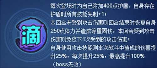 第二条效果,本回合未受到攻击伤害则恢复体力并附加固伤,包括对手使用属性技能、吃药、切换的回合。另外如果对手的伤害打在了护盾上或本回合免疫伤害的情况下,都能触发该效果。保证续航的同时增加了粉伤输出。本回合受到攻击伤害则免疫下一次伤害,需要注意的是这个效果必须是对方在本回合造成了红伤伤害的情况下才会触发。如果打在了护盾上,且伤害没有穿透护盾,则不会触发该效果。免疫伤害效果为纯粹的挡伤,不能免疫技能附带的效果。