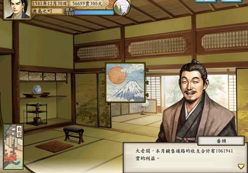 商人职业在做到大老板后,可以通过开分店,增加销售通路的数量,上限是19条,每条利润上限6万。海外通路是最赚钱的,一般19条都通往海外最优。总上限每月收入114万。(图中为销售通路稳定后的收益,一般刚连接海外町收益会高,2-3个月后收益稳定)