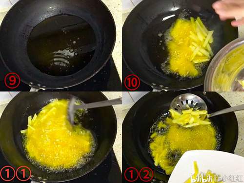 ⑩.油温6成热把土豆条放进去(可以用筷子试一下油温,冒泡就可以)