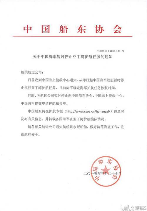 3月27日,中国船东协会在中国船东网发布了“关于中国海军暂停亚丁湾护航任务的通知”。
