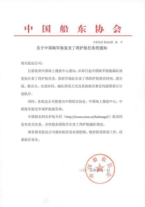 4月1日,中国船东协会于中国船东网上发布了“关于中国海军恢复亚丁湾护航任务的通知”。