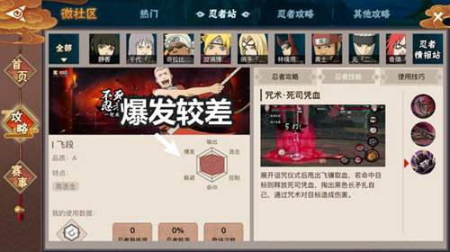 看完了该忍者的技能介绍之后很多玩家们对这个忍者心中已经有了个底,我们通过看该忍者的面板也能了解到在输出能力方面该忍者属于较差水平,爆发力也是比较不足的,相对于那些一个奥义技能打掉对方半管血的忍者来说飞段是完全比不上的,很多忍者在一些技能上面也会领先于飞段,在对战中就不能进行硬刚。
