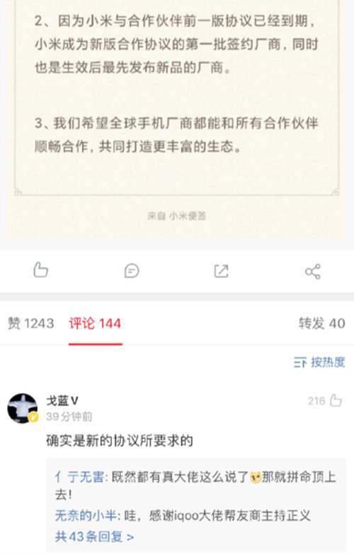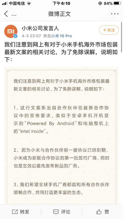 4月3日晚上11:57,小米公司发言人辟谣这是与谷歌签订了最新的销售协议,按照协议要求要加上这一句话。因为小米10系列是签订协议后的第一款旗舰手机所以现在只能看到小米的包装上印有这句话,而且蓝厂高管也评论证实了此协议确实存在。