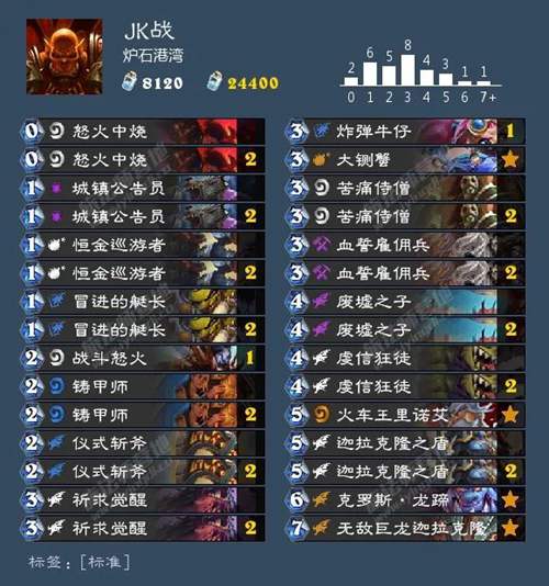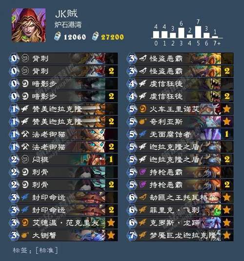 由于拥有行云流水般的操作,JK贼依旧是高分段玩家最爱的卡组,表现相当稳定。为了针对环境,现在都会带上持枪恶霸。