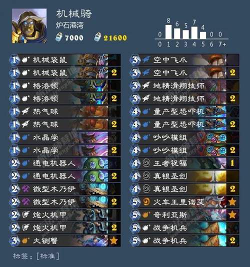 其实这个数据略有水分,因为他的对局数据绝大部分都是集中在低分段。只要天梯排位稍微高一点,机械骑就很少见到了。我不怎么推荐大家在比赛中用这个卡组。